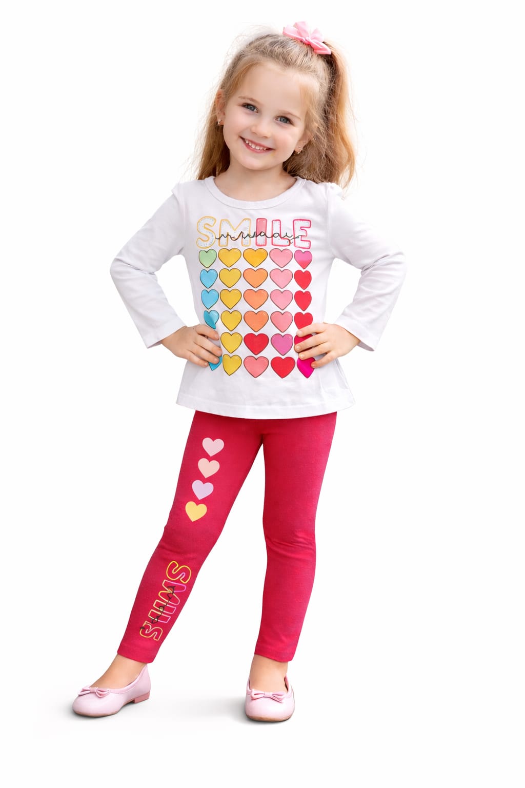 O Conjunto Abrange Meia Estação é perfeito para deixar as pequenas estilosas e confortáveis nos dias de clima ameno. A blusa branca de manga longa com estampa “SMILE” e corações coloridos traz um visual alegre e supermoderno, enquanto a legging pink com detalhes de corações e escrita lateral completa o look com muito charme e praticidade.