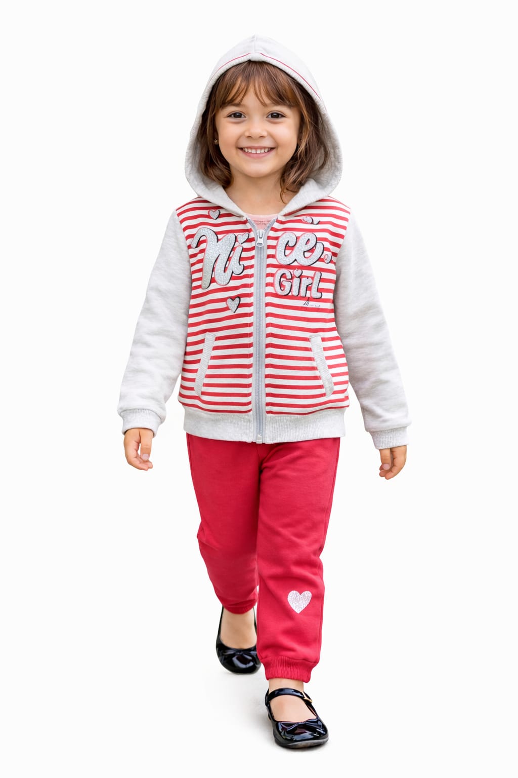 O Conjunto Abrange Moletom é perfeito para deixar as pequenas estilosas e bem aquecidas nos dias mais fresquinhos. A jaqueta com capuz em listras vermelhas e cinza, com estampa “Nice Girl” e fechamento em zíper, traz um visual moderno e cheio de charme. A calça vermelha com detalhe de coração completa o look com conforto e praticidade.