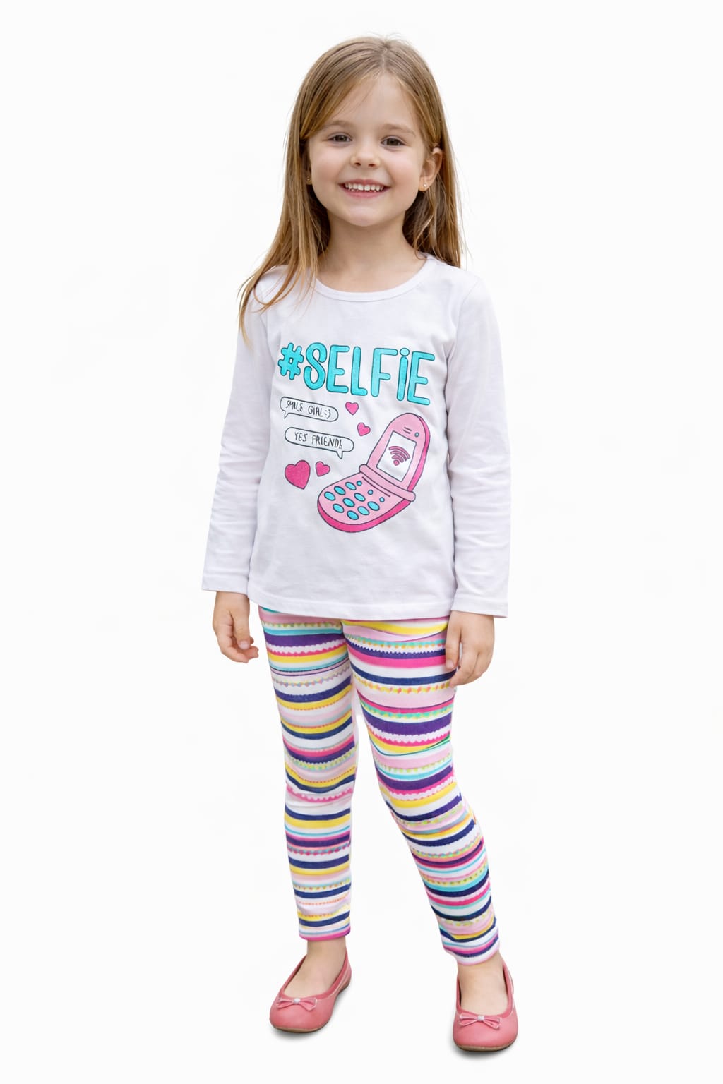 O Conjunto Anale Meia Estação #Selfie é perfeito para deixar as pequenas estilosas e confortáveis nos dias de clima ameno. A blusa branca de manga longa com estampa divertida “#Selfie” traz um toque moderno e cheio de personalidade, enquanto a legging listrada colorida completa o look com muito charme e praticidade.
