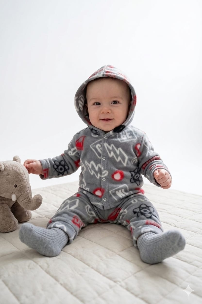 Composto por casaco com capuz e calça, o conjunto possui estampa divertida que deixa o look do bebê ainda mais fofo e moderno. O casaco conta com fechamento por botões frontais, facilitando na hora de vestir, enquanto a calça oferece ajuste confortável para acompanhar os movimentos do bebê.