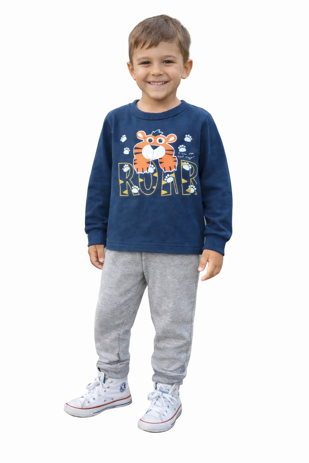O Conjunto Cleomara Moletom Roar Tigre é perfeito para deixar os pequenos quentinhos e cheios de estilo nos dias mais fresquinhos. O blusão azul-marinho traz estampa divertida de tigre com a palavra “ROAR”, garantindo um visual moderno e alegre. A calça mescla cinza completa o look com ótimo caimento e muito conforto.