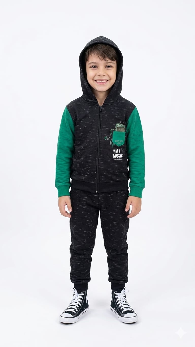 O conjunto conta com jaqueta de moletom com capuz e zíper frontal, trazendo um visual moderno com detalhes contrastantes nas mangas e estampa temática que deixa o look ainda mais estiloso. A calça em moletom flanelado complementa o conjunto com ótimo caimento e conforto, ideal para acompanhar os pequenos em todas as atividades do dia a dia.