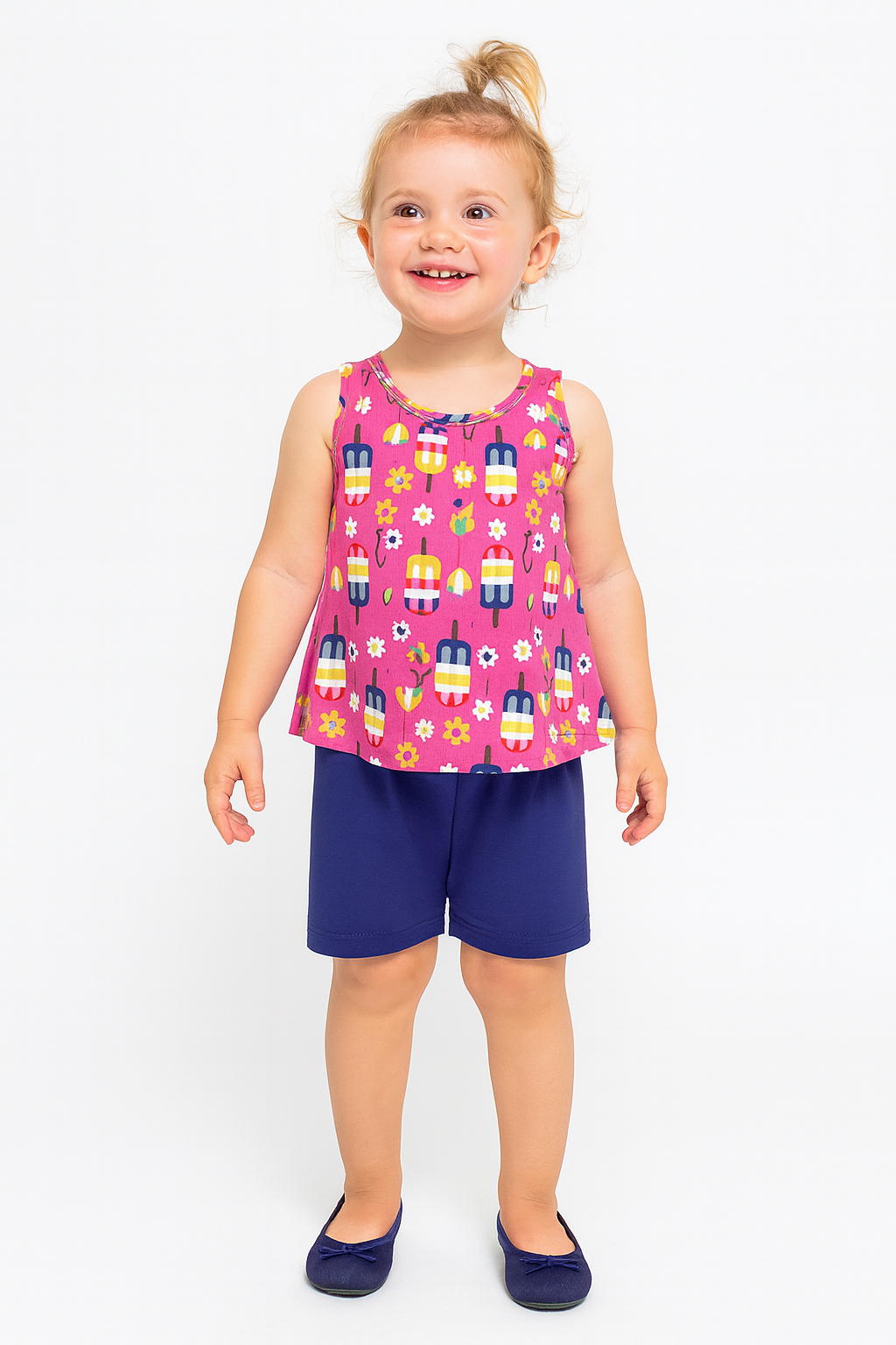 Deixe o dia da sua pequena ainda mais divertido com este conjunto superfofo! A regata rosa traz uma estampa alegre de sorvetes coloridos, flores e coraçõezinhos, criando um visual encantador e cheio de estilo. Confeccionada em tecido leve e confortável, é ideal para dias quentes.