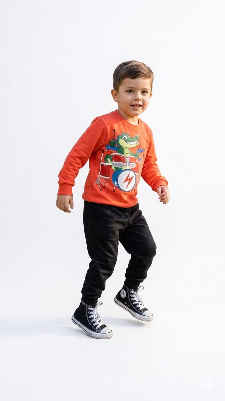 O Conjunto Infantil Kyly em Moletom é perfeito para meninos que gostam de looks divertidos e cheios de personalidade. 🦖🥁