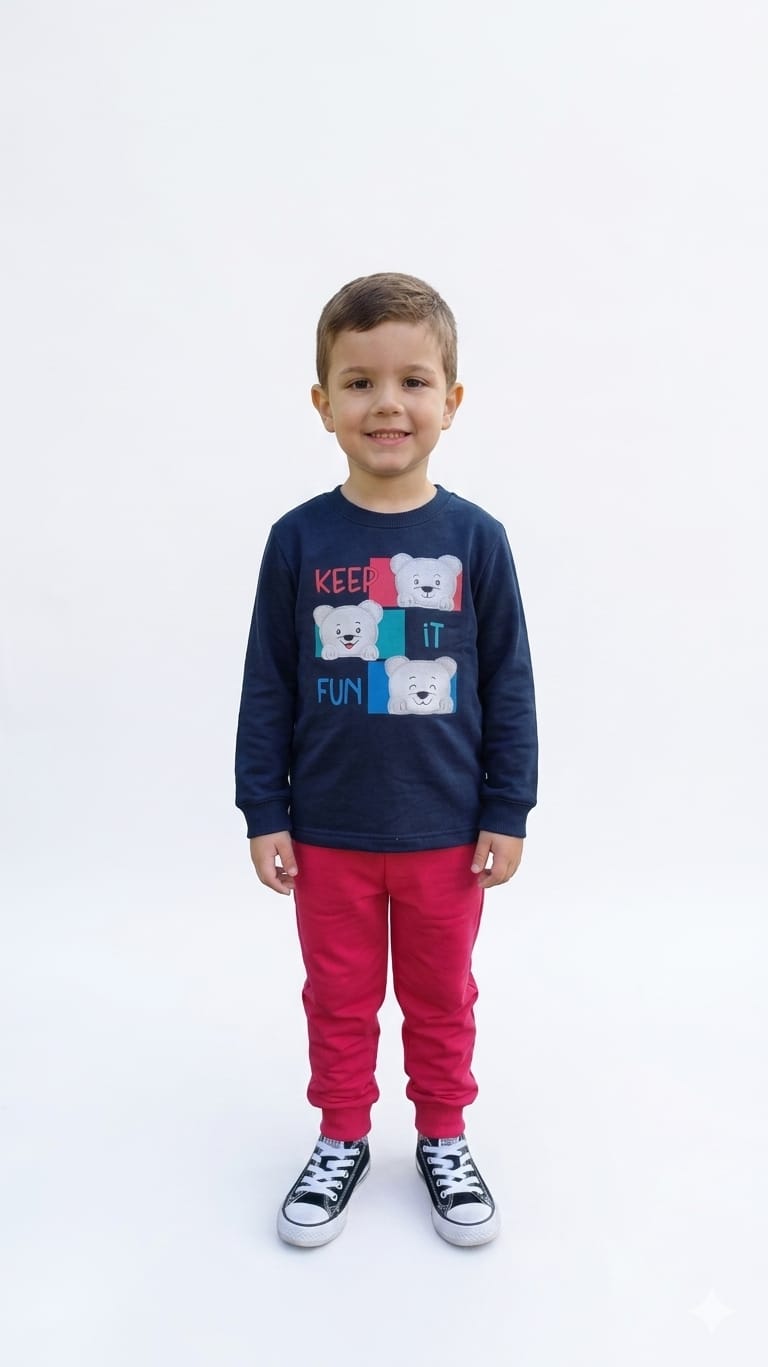 A blusa de manga longa em moletom flanelado possui estampa divertida de ursinhos com a frase “Keep it Fun”, trazendo um visual alegre e moderno para o look infantil. A calça em moletom completa o conjunto com ótimo caimento e conforto, ideal para acompanhar as crianças em todas as atividades do dia.