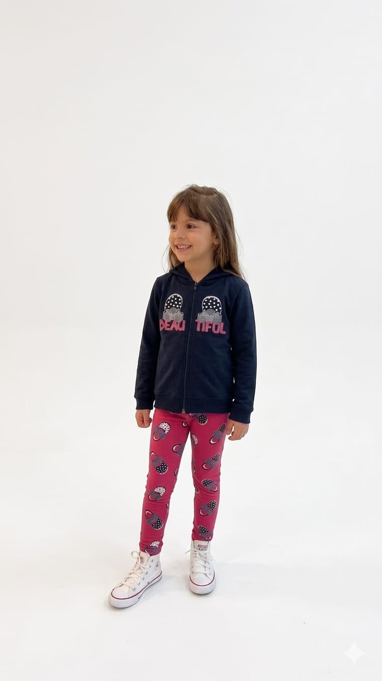 A jaqueta de moletom com capuz e fechamento em zíper possui estampa frontal moderna com a palavra “Beautiful”, trazendo um toque delicado e fashion ao look. A legging estampada complementa o conjunto com muito charme e conforto, garantindo liberdade de movimento para brincar, passear ou ir à escola.