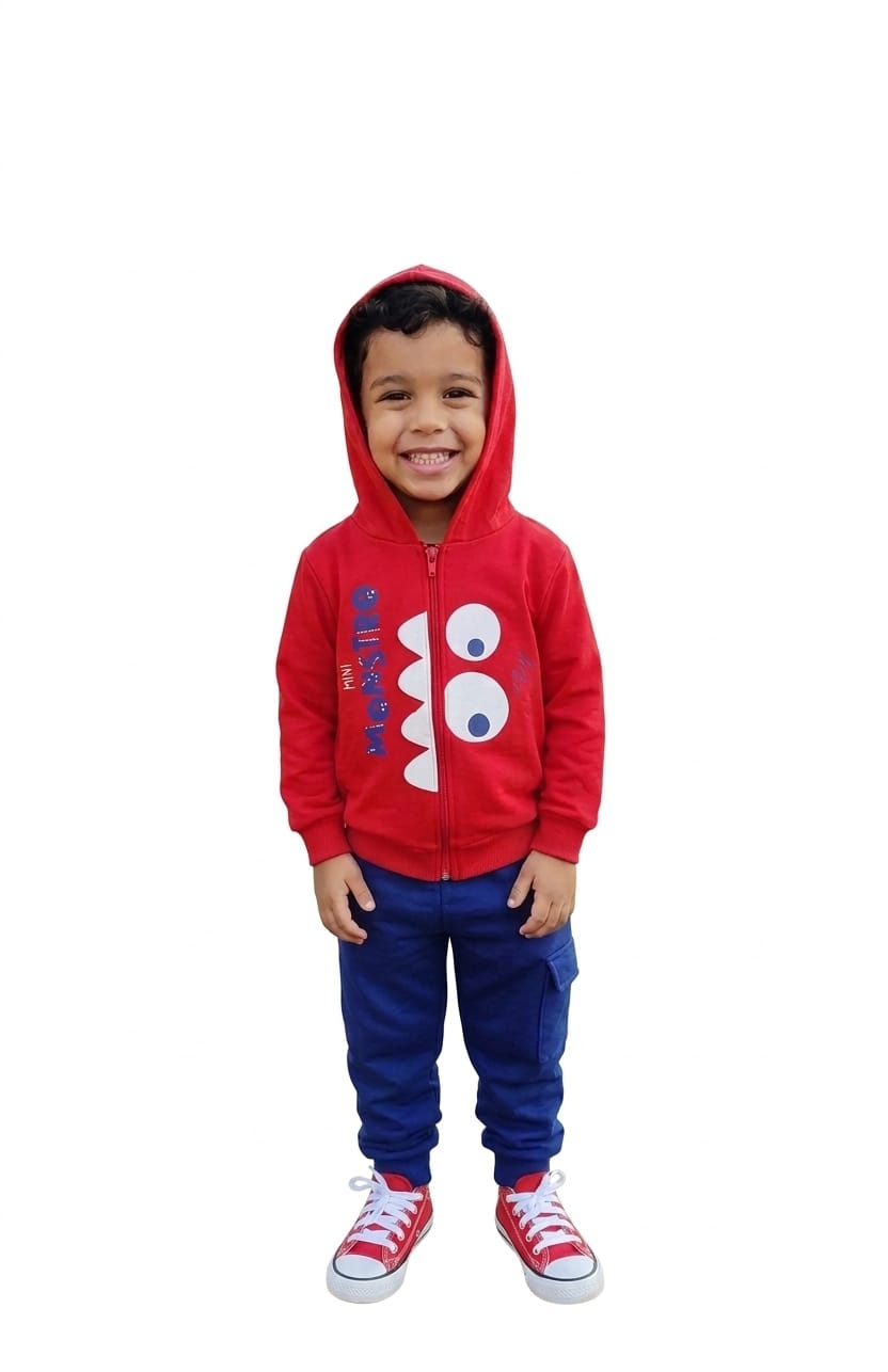 Perfeito para a meia estação, o Conjunto Infantil Malwee em moletom sem flanela une conforto e um visual divertido para o dia a dia. A jaqueta vermelha com capuz e zíper traz estampa de monstrinho com olhos em destaque, deixando o look moderno e cheio de personalidade. A calça azul complementa o conjunto com modelagem confortável e bolso lateral, ideal para acompanhar as brincadeiras, passeios e a rotina da escola com liberdade de movimentos.
