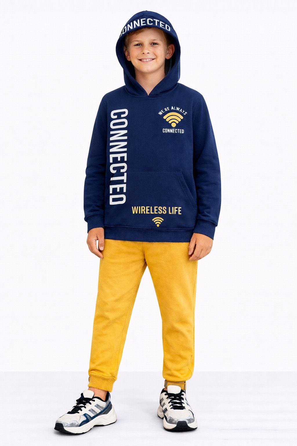 O Conjunto Kyly Connected Wireless Life é perfeito para os dias frios, com toque macio e aconchegante por ser flanelado. O moletom marinho com capuz e bolso canguru traz estampa moderna “Connected”, com detalhes inspirados no universo digital, deixando o visual cheio de estilo.