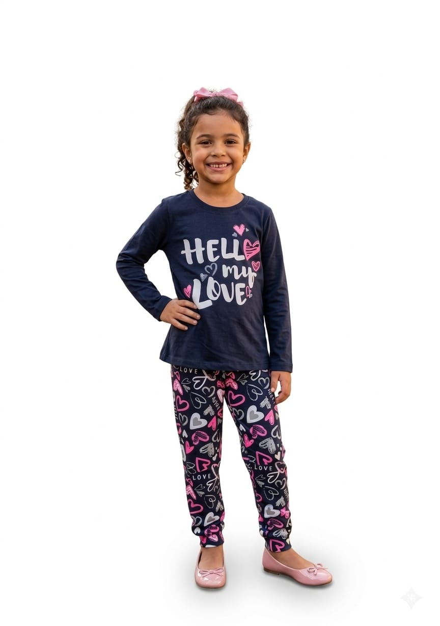 O Conjunto Meia Estação Infantil Elian Hello My Love é perfeito para deixar o visual das pequenas ainda mais delicado e cheio de estilo. Com blusa de manga longa em tom escuro e estampa frontal divertida com corações e lettering, combinada com calça estampada cheia de charme, o conjunto cria um look moderno e encantador.