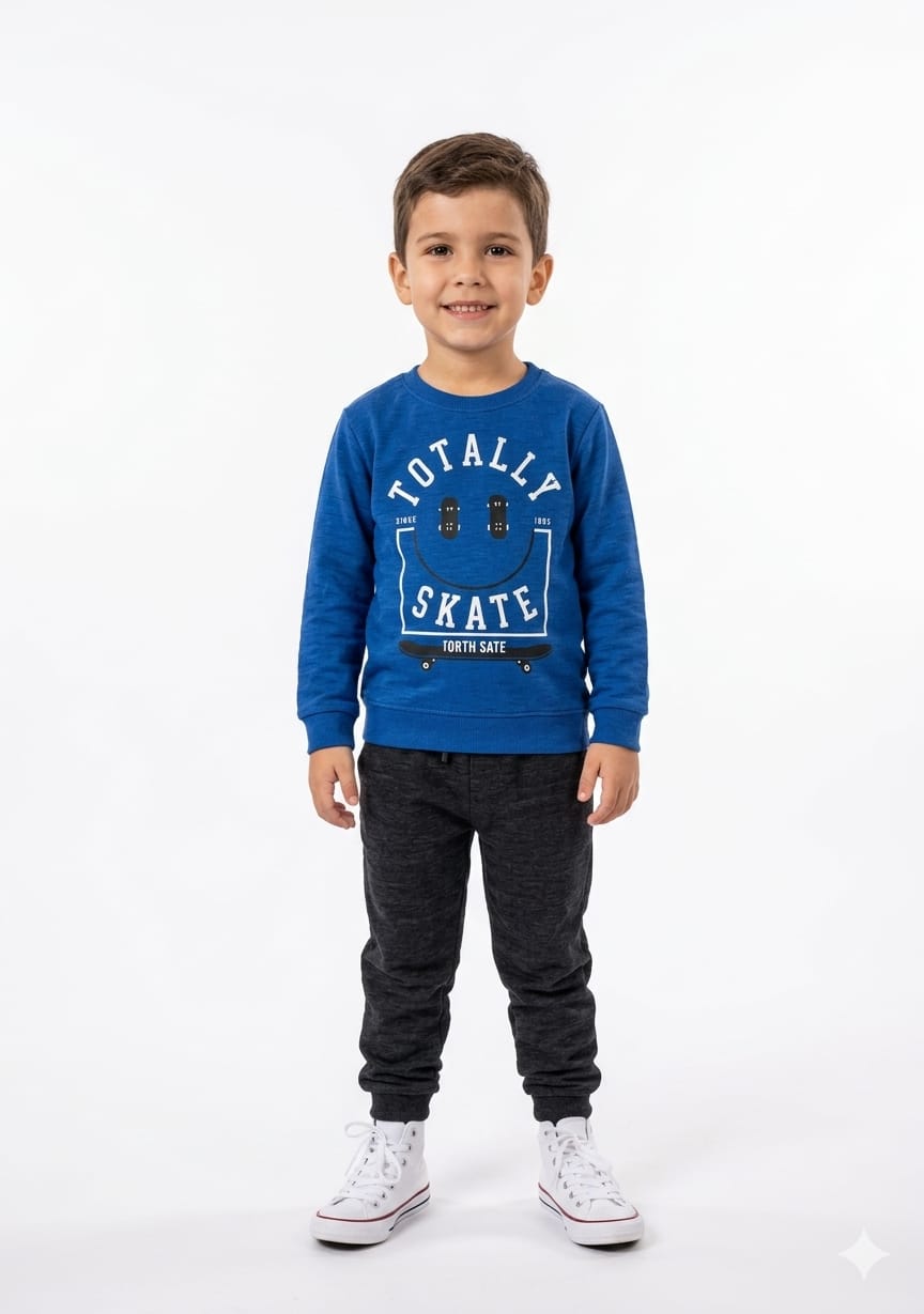 O Conjunto de Moletom Cato Lelê é a escolha certa para deixar os pequenos confortáveis e cheios de estilo nos dias mais fresquinhos. A blusa em tom azul traz estampa moderna “Totally Skate” com detalhe de skate, perfeita para um visual urbano e descolado. A calça de moletom em cor escura completa o look com caimento macio e confortável, garantindo liberdade para brincar e passear o dia todo.