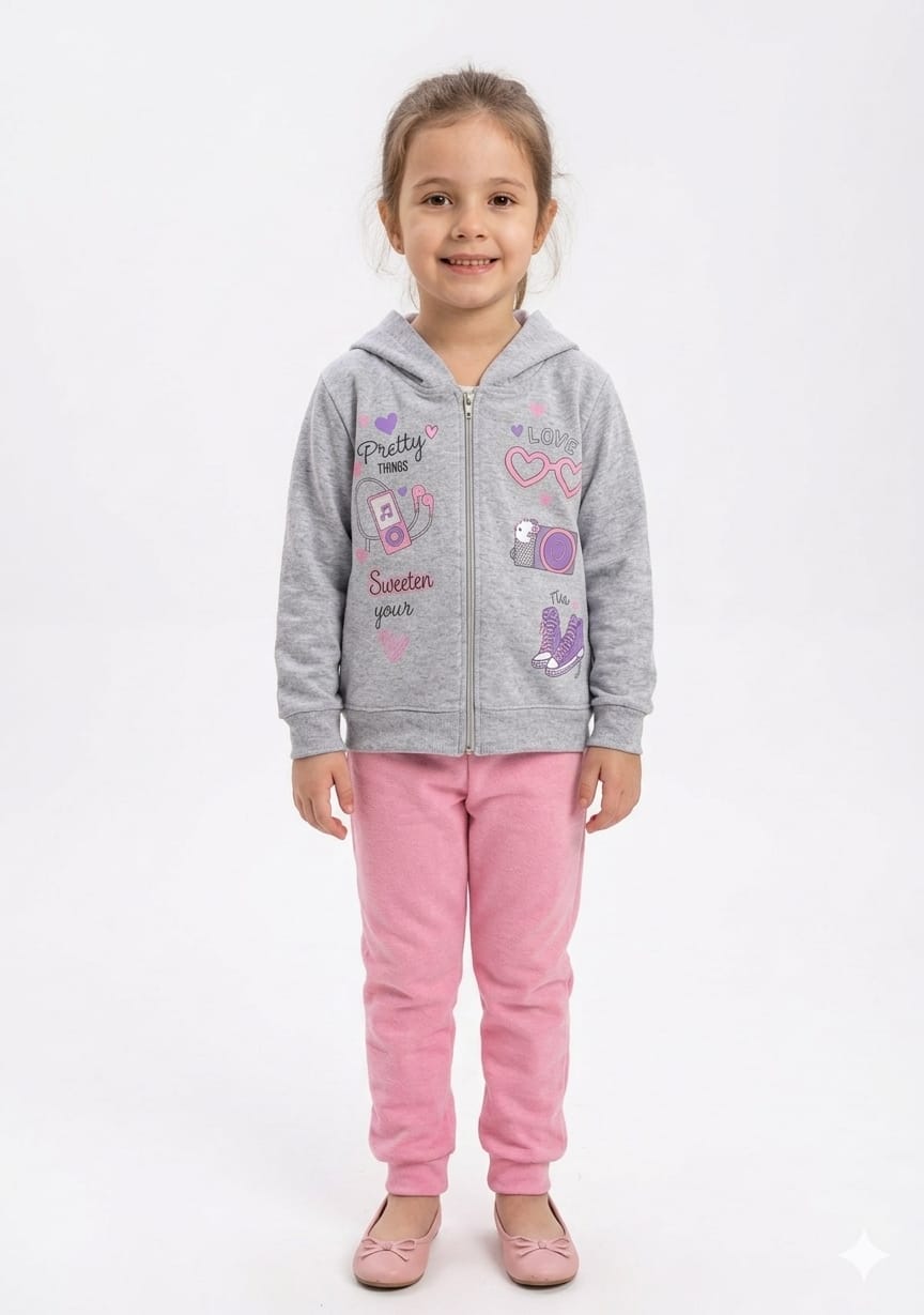 O Conjunto Moletom Infantil Cato Lelê Pretty Love é perfeito para deixar os dias mais fresquinhos ainda mais confortáveis e cheios de charme. Com jaqueta de moletom com capuz, fechamento em zíper e estampa frontal delicada, combinada com calça em tom suave, o conjunto traz um visual moderno, alegre e encantador para as pequenas.