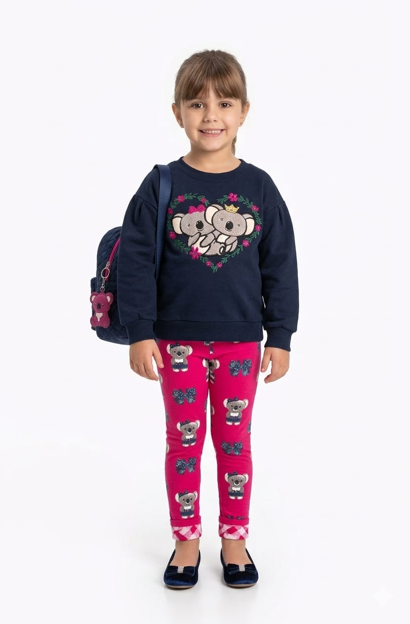O Conjunto Moletom Infantil Kyly Koalinhas é perfeito para trazer conforto, charme e delicadeza ao look das pequenas. Com blusão de moletom em tom marinho e estampa frontal de koalinhas com detalhes florais, combinado com calça legging estampada em cor vibrante, o conjunto cria uma produção alegre, moderna e cheia de fofura.