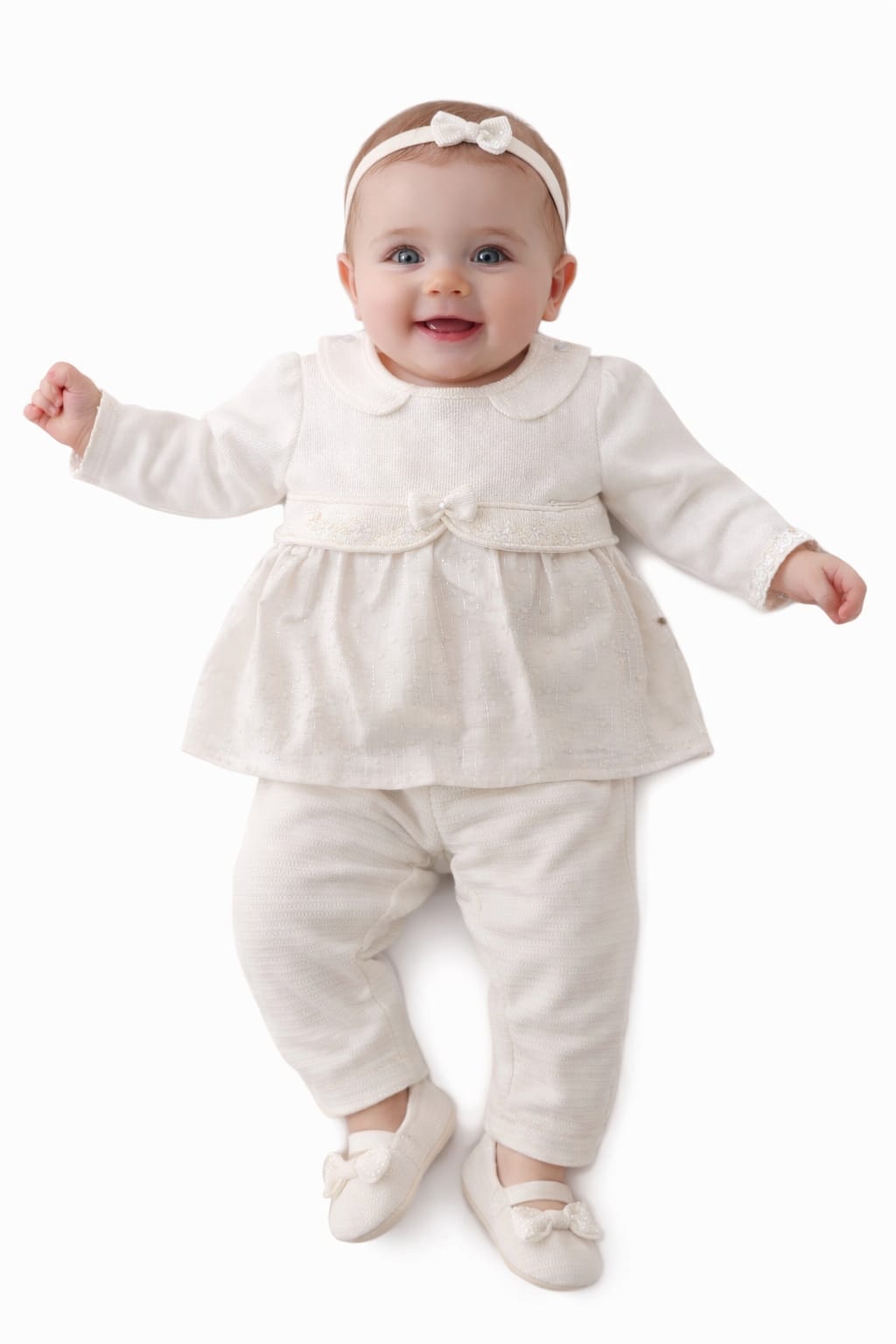 Delicado e super aconchegante, o Conjunto Paraíso Moletom – Princesa Off White é perfeito para deixar a bebê quentinha com muito charme. A blusa tem modelagem estilo vestidinho, com gola arredondada, saia em tecido leve com brilho sutil e laço frontal, trazendo um toque sofisticado. A calça acompanha no mesmo tom, garantindo conforto e liberdade para brincar e passear.