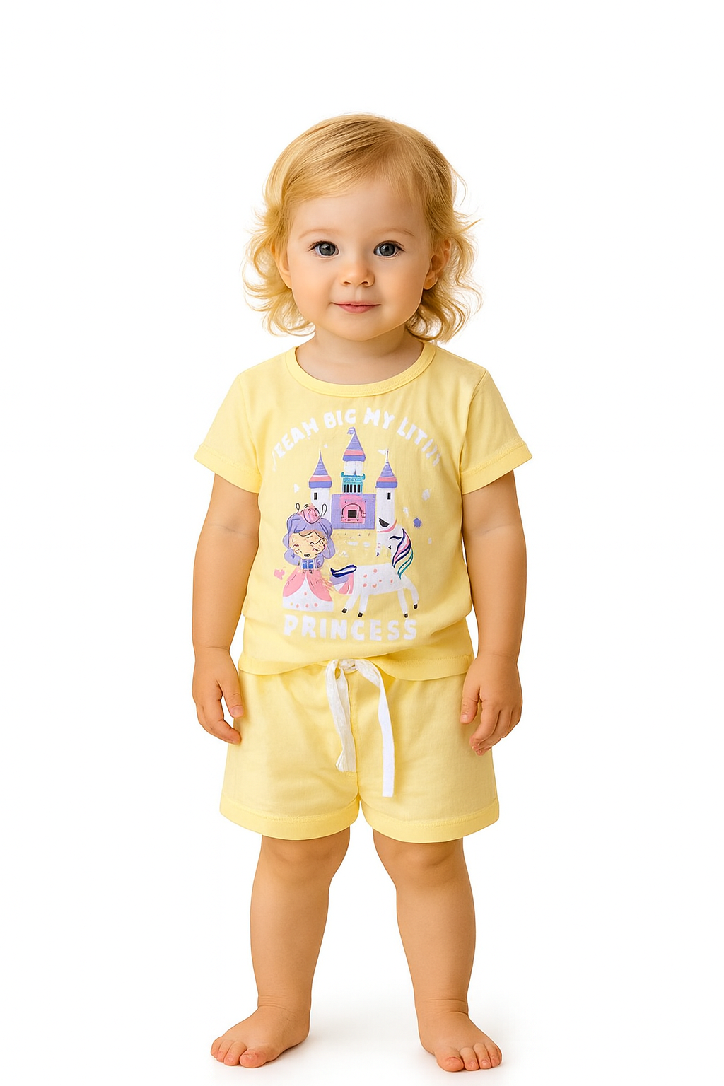 O Pijama Princesinha Sonhos Dourados é a escolha perfeita para noites leves, confortáveis e cheias de fantasia. Em um tom amarelo suave, o conjunto traz uma estampa adorável com castelo, princesa e unicórnio, inspirando imaginação e ternura. Feito em tecido macio e respirável, proporciona conforto ideal para o sono e para momentos de brincadeira antes de dormir. O short com ajuste na cintura garante praticidade e liberdade de movimento, tornando esse pijama tão confortável quanto encantador. Uma opção doce e mágica para pequenos que sonham alto.