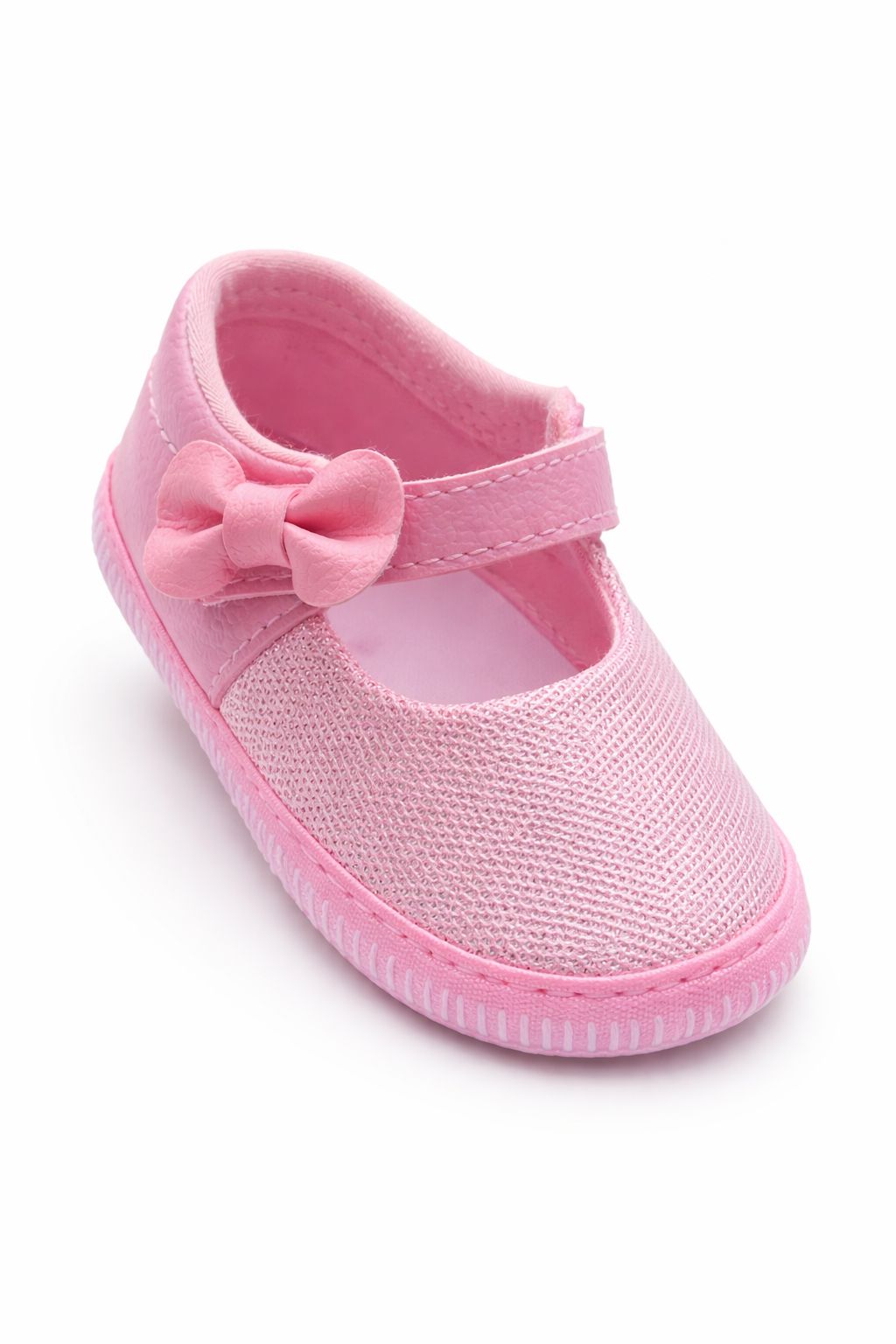 Seu design delicado conta com laço lateral e parte frontal em tecido com brilho suave, deixando o visual ainda mais encantador. O solado leve e flexível proporciona estabilidade e conforto para acompanhar os primeiros passinhos com segurança. Ideal para passeios, festas e looks cheios de fofura!
