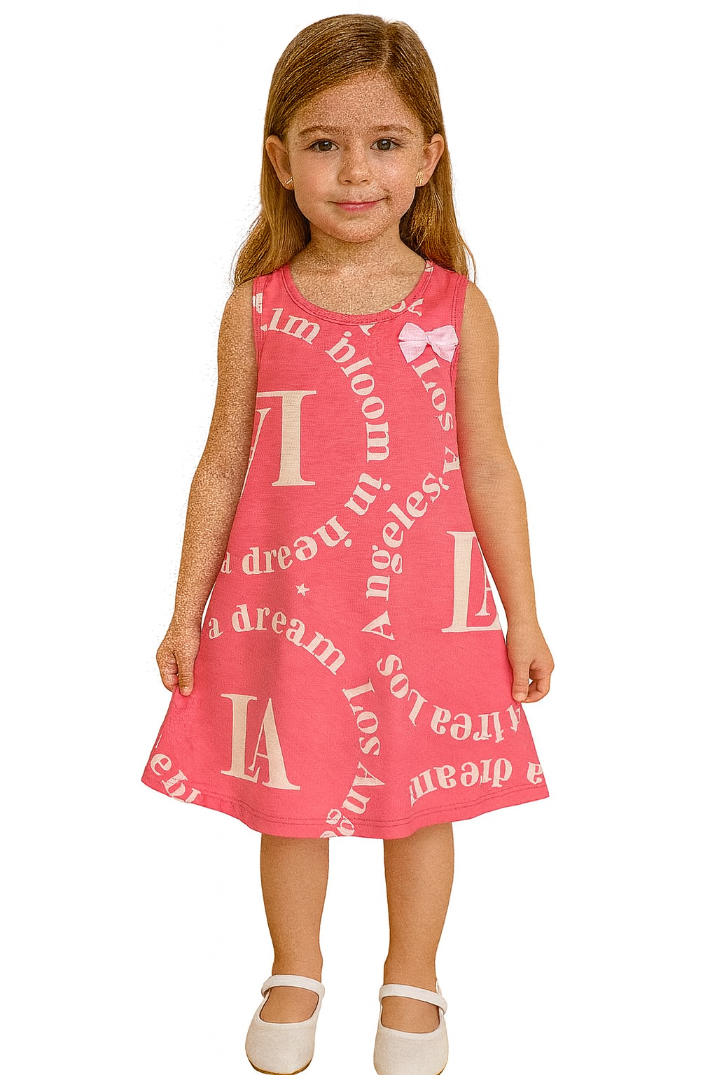 Um vestido infantil encantador em tom rosa vibrante, com estampa moderna inspirada em Los Angeles. Feito em tecido leve e confortável, possui modelagem soltinha em estilo A-line, que oferece liberdade para brincar. O detalhe do lacinho rosa próximo ao colo adiciona um toque delicado e feminino. Perfeito para passeios, festas ou para trazer alegria ao dia a dia.